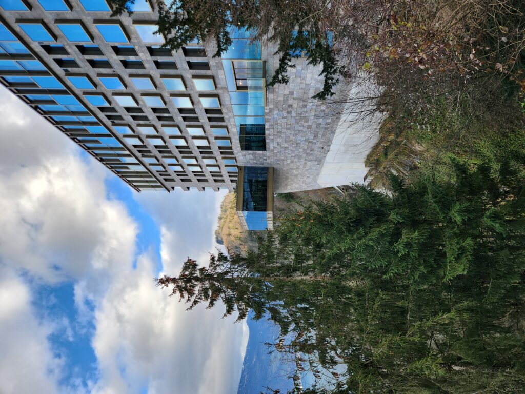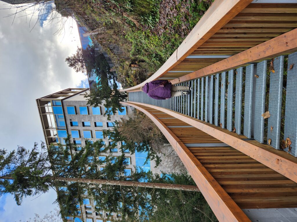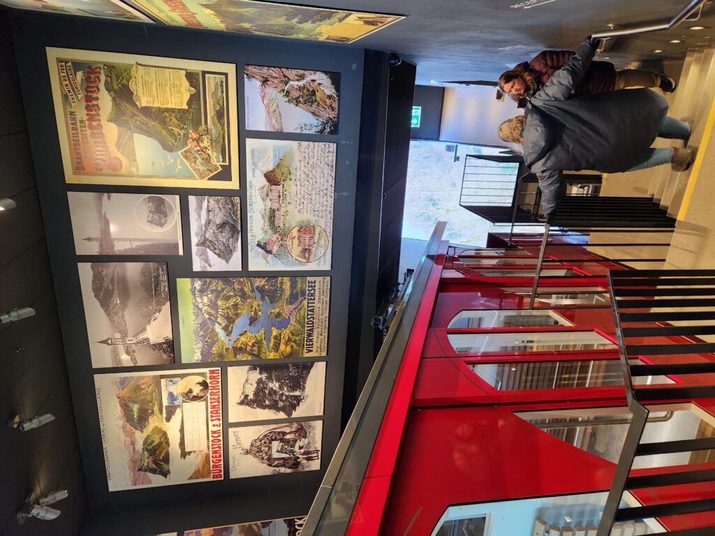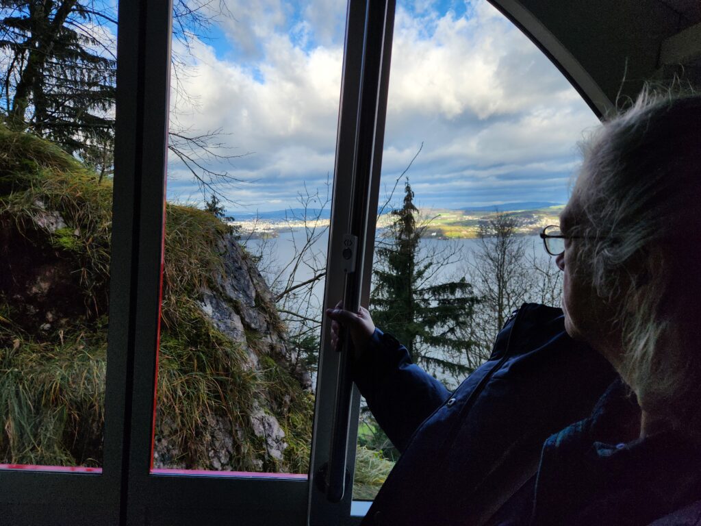 When we got to pier 7 we realized we needed to be at 3. Luckily it wasn’t that far and we made it there with plenty of time to spare. It being the off-season it was just a little over 100CHF round-trip for the three of us and included not only the catamaran ride over but also the funicular up to the resort at 2,000′. There were hardly any people on the boat nor at the resort. We arrived at the top about 10:30am and after using the restroom took some pictures. Genetta and I took a short walk and went over a metal suspension bridge and saw a few carved wooden sculptures. Afterwards, we shopped a bit with Genetta getting a postcard and the both of us getting a free coffee (as part of the initial ticket price).