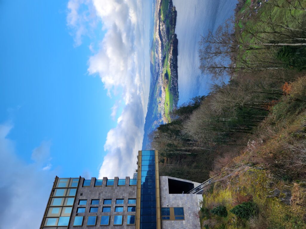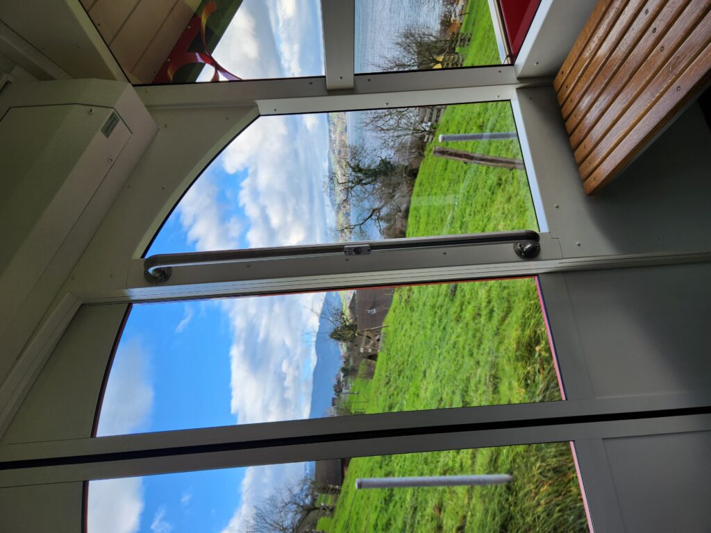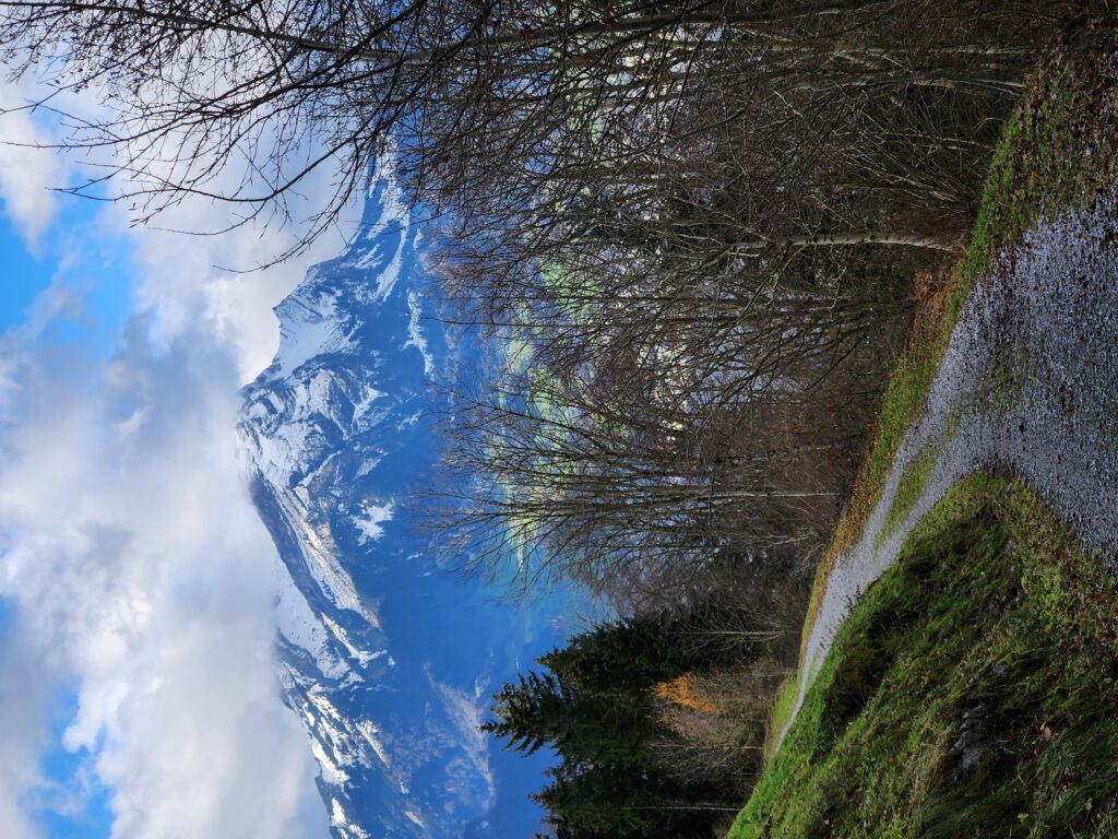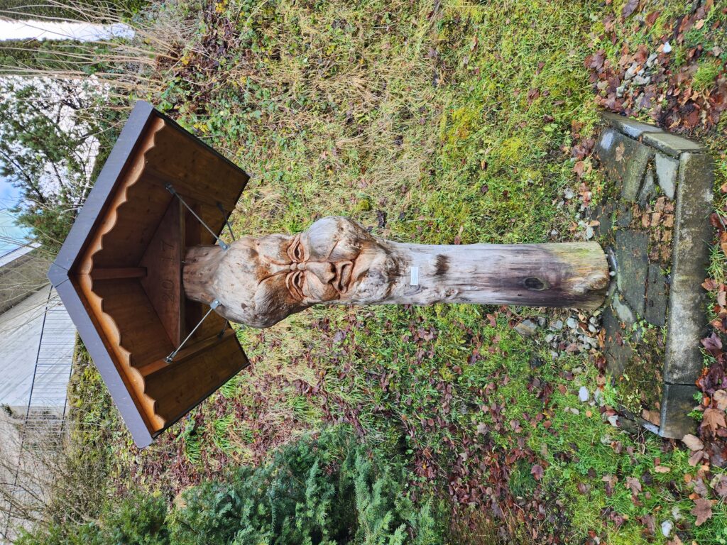 When we got to pier 7 we realized we needed to be at 3. Luckily it wasn’t that far and we made it there with plenty of time to spare. It being the off-season it was just a little over 100CHF round-trip for the three of us and included not only the catamaran ride over but also the funicular up to the resort at 2,000′. There were hardly any people on the boat nor at the resort. We arrived at the top about 10:30am and after using the restroom took some pictures. Genetta and I took a short walk and went over a metal suspension bridge and saw a few carved wooden sculptures. Afterwards, we shopped a bit with Genetta getting a postcard and the both of us getting a free coffee (as part of the initial ticket price).