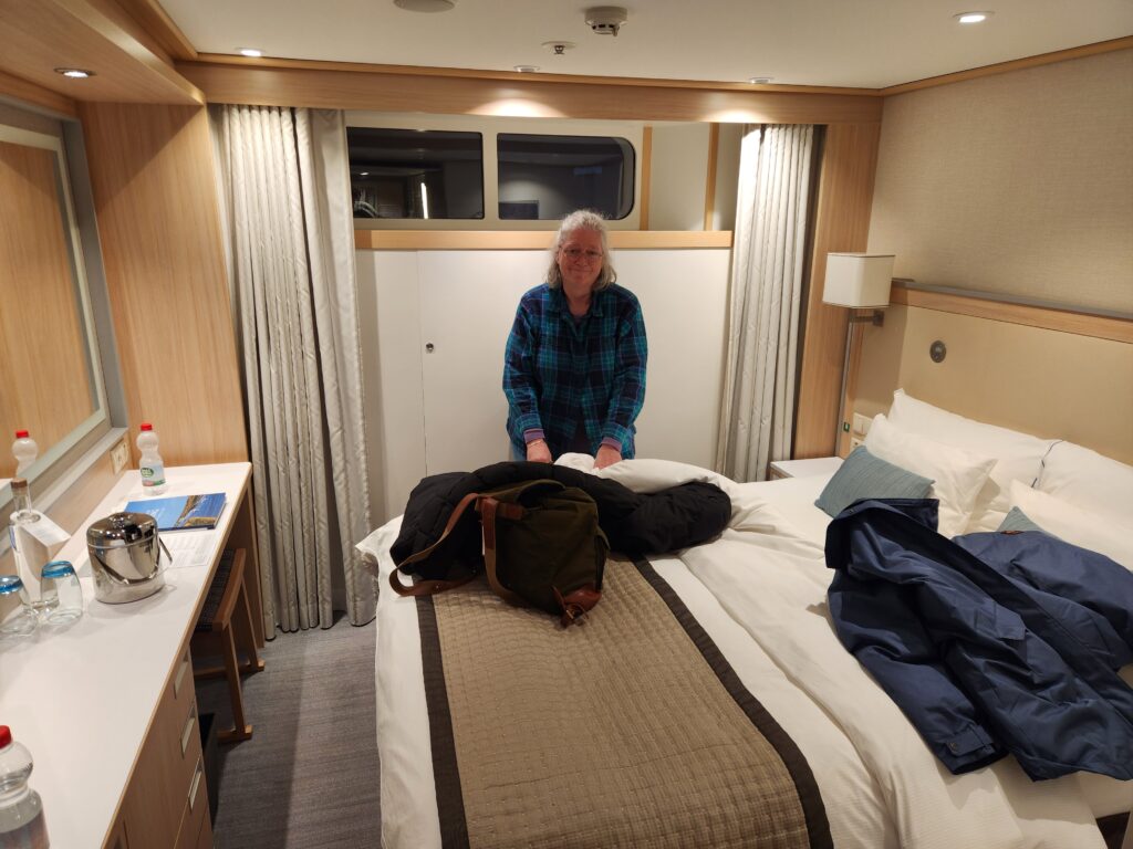The rooms were small, no doubt, but very functional, bright, and clean. Very Nordic. We took the time to unpack into both the dresser and the coat closet and placed our suitcases under our bed. It was a bit crazy to look out the window (at chest height) and see the water level just a foot below eye level. We headed to a 6:15pm orientation where we met the captain (a Dutchman), our manager (Mohammed), our head chef (and he looked every bit a chef and did this rubbing-tummy-“yummmmmmm” thing), and our on-board tour coordinator, Sharon. Afterwards we had a quick safety check involving our life jackets on the main deck.